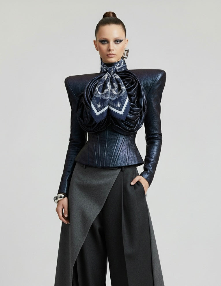 色彩搭配採用深藍與珍珠白的色彩搭配。深藍象徵著海洋的深邃和無窮的力量,而珍珠白則代表著純淨和平靜。這種色彩的融合,讓絲巾散發出優雅與莊重的氣質。